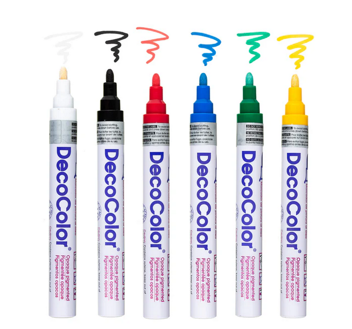 Use these DecoColor 300-s Broad Point paint marker pen to write out large messages on glass or mirrors or to cover a larger surface area on other projects. The larger tip of this paint pen allows for a quick covering of any glass, paper, wood, clay, porcelain, stone, metal, or mirror surface. The paint is acid-free, lightfast, weatherproof, and pigmented.