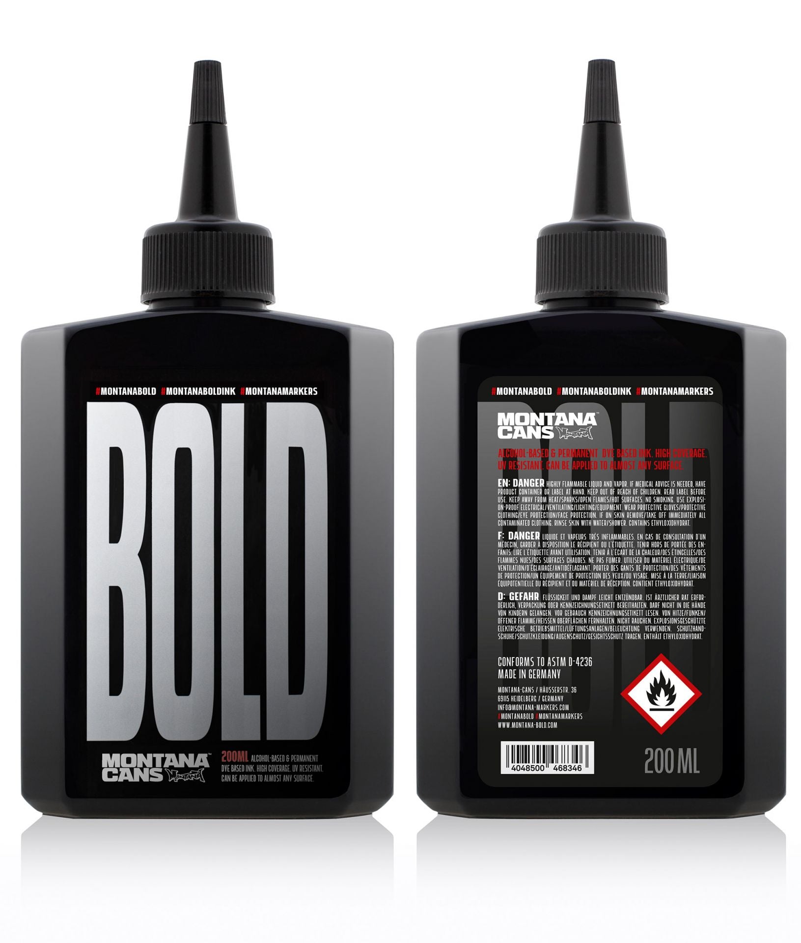 The Montana BOLD 200ml ULTRA INK refill is the foundation of your graffiti and tagging marker needs. The hard wearing plastic bottle is fitted with a witches hat, re-sealable lid, that comes to a sharp accurate point for efficient and clean refilling. Building on the already much loved Montana “Strong Black” ink formula, the ULTRA INK is the contemporary optimized version of what was already great. The state of the art, alcohol based, permanent ink leaves rich, luscious semi-gloss marks that are “made to stay”. If the buff doesn’t get it, the sun won’t have much luck either as the ink is not only lightfast and UV resistant, but abrasion resistant as well.