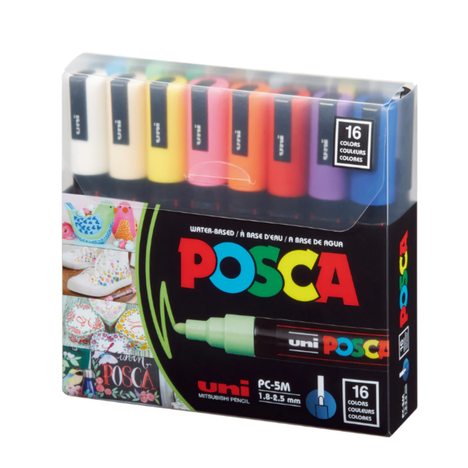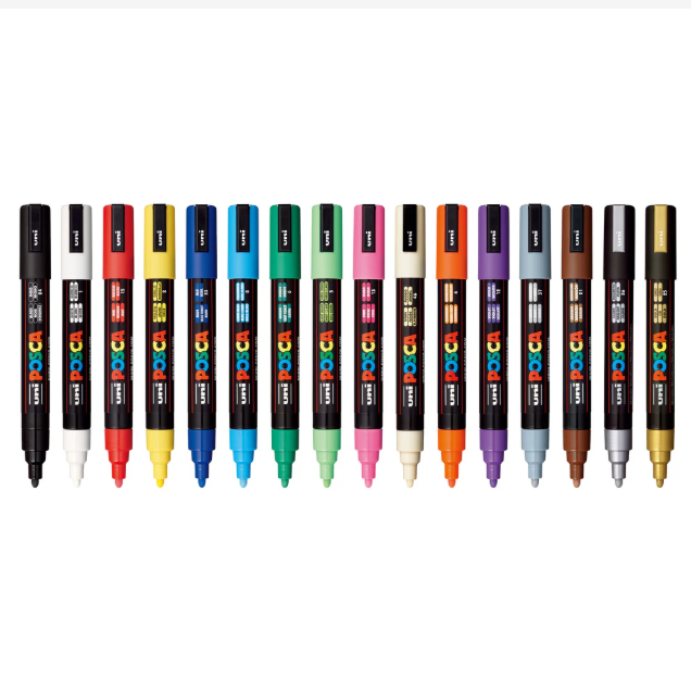 The medium Uni Posca PC-5M markers have a 1.8-2.5mm bullet tip that writes on any surface.